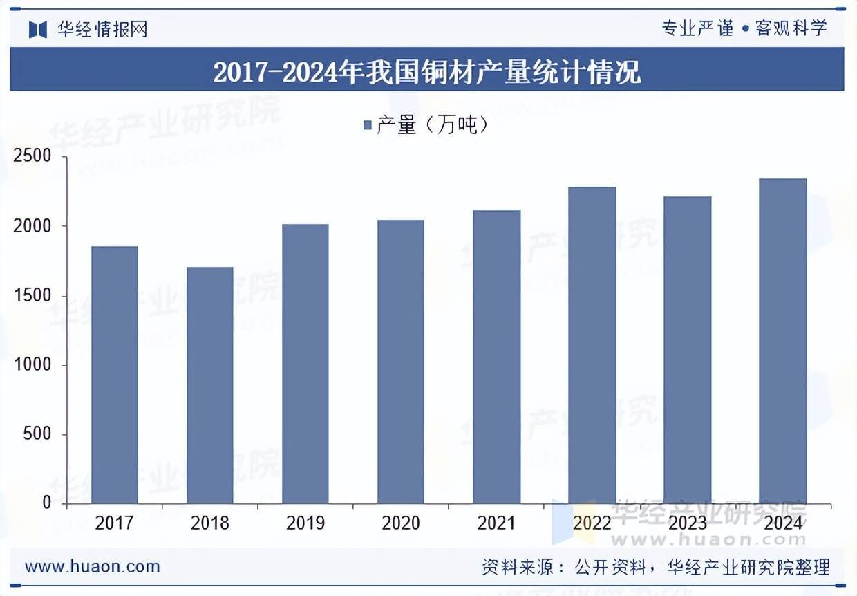 我国铜材行业流程万古辰的发展,照旧成为大家最大的铜材坐褥国、贸易国和铺张国,铜材的产量和铺张量已占世界总量的60%以上,在海外铜加工行业占有要紧的产业地位。笔据国度统计局数据显现:2024年12月我国铜材产量为227万吨,同比增长8.9%;2024年1-12月中国铜材累计产量为2350.3万吨,累计增长1.7%。