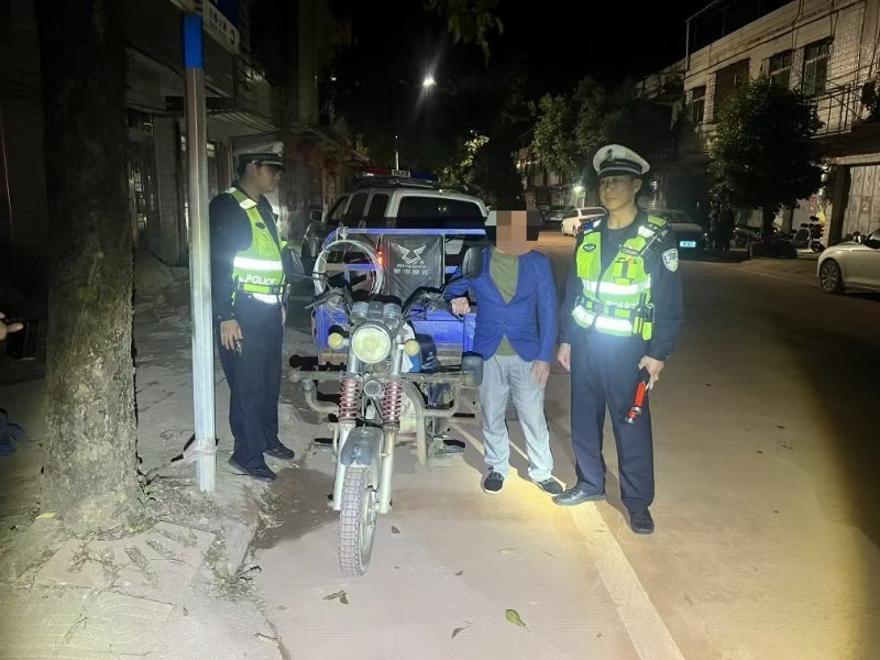 12月3日晚,惠州市博罗县公安局交警大队抓勤民警在博罗县泰好意思镇建新路路段设点开展夜查看成时,发现一辆无号牌三轮摩托车正向查抄点驶来,驾驶东说念主脸部通红。民警悟得有蹊跷,便赶快跑向前将该车拦停进行查抄。民警在对驾驶东说念主进行盘考时,发现其身上泄气出一股酒味。
